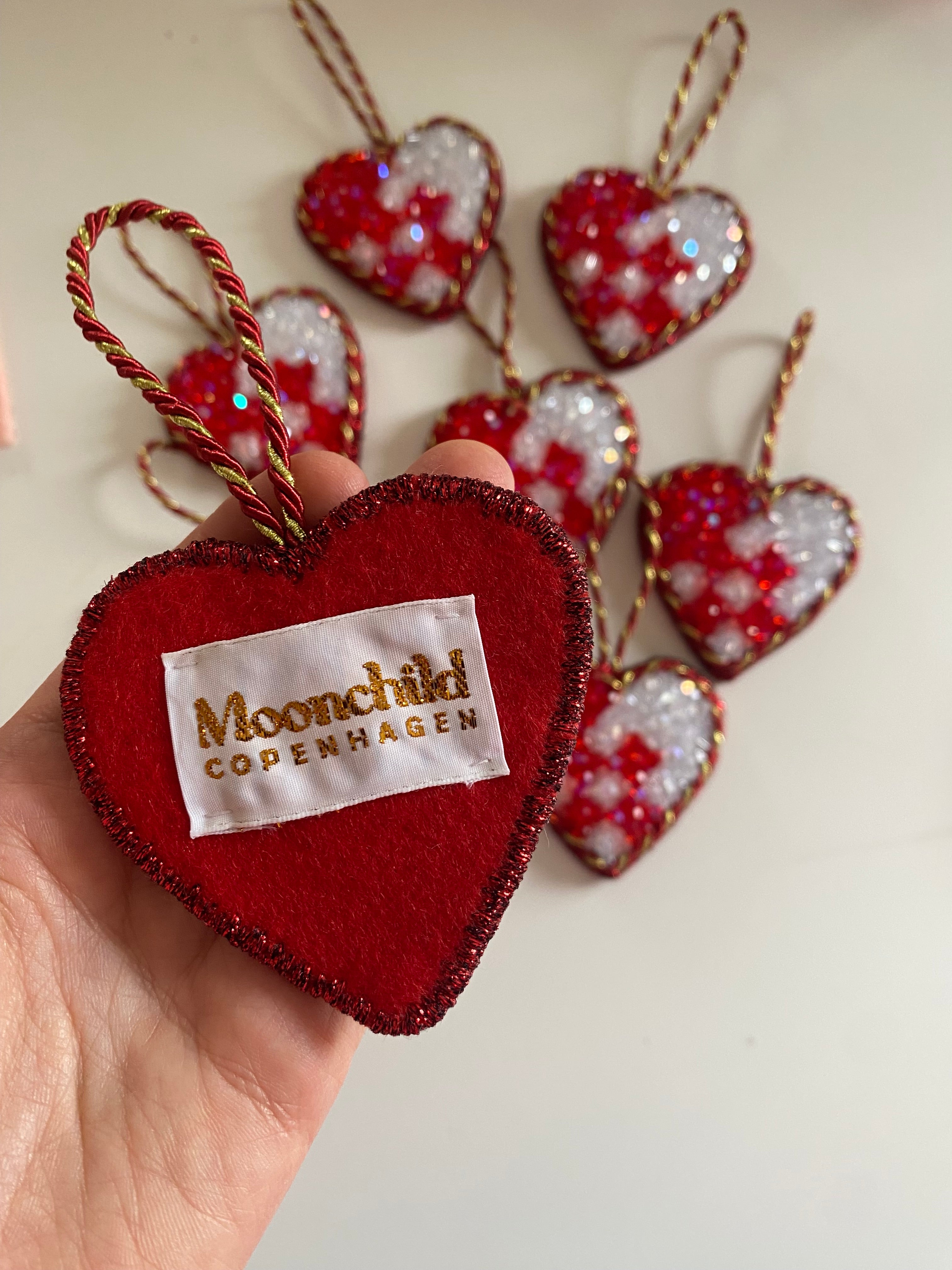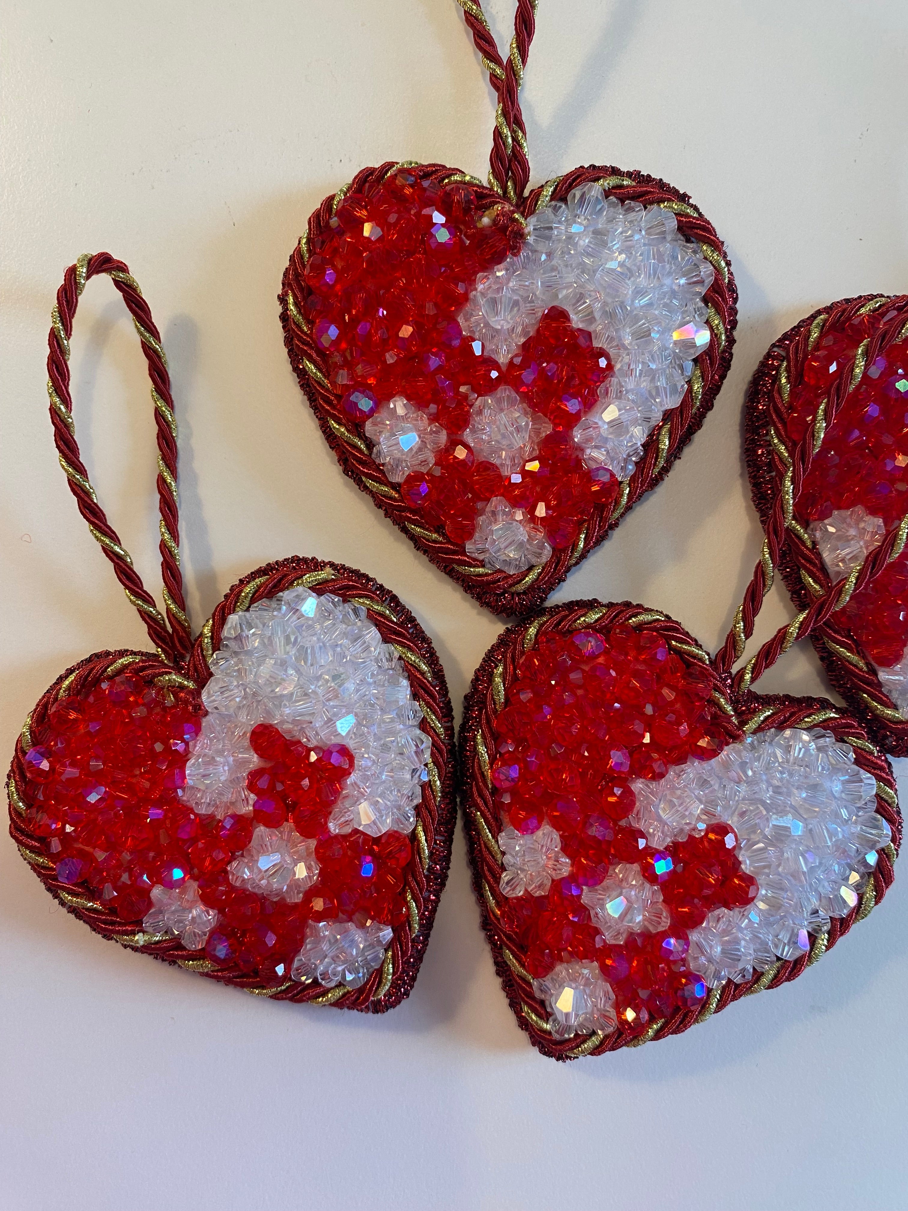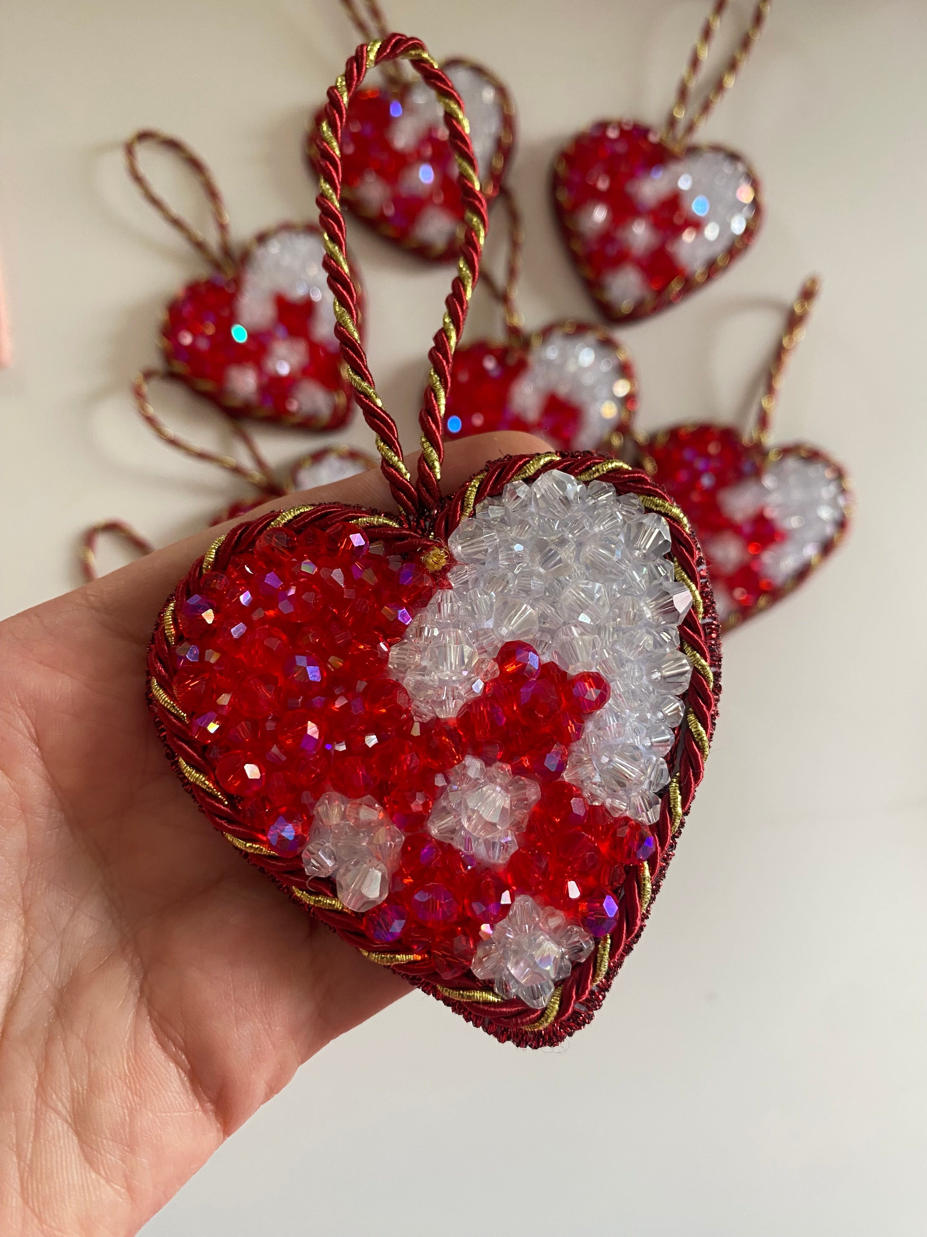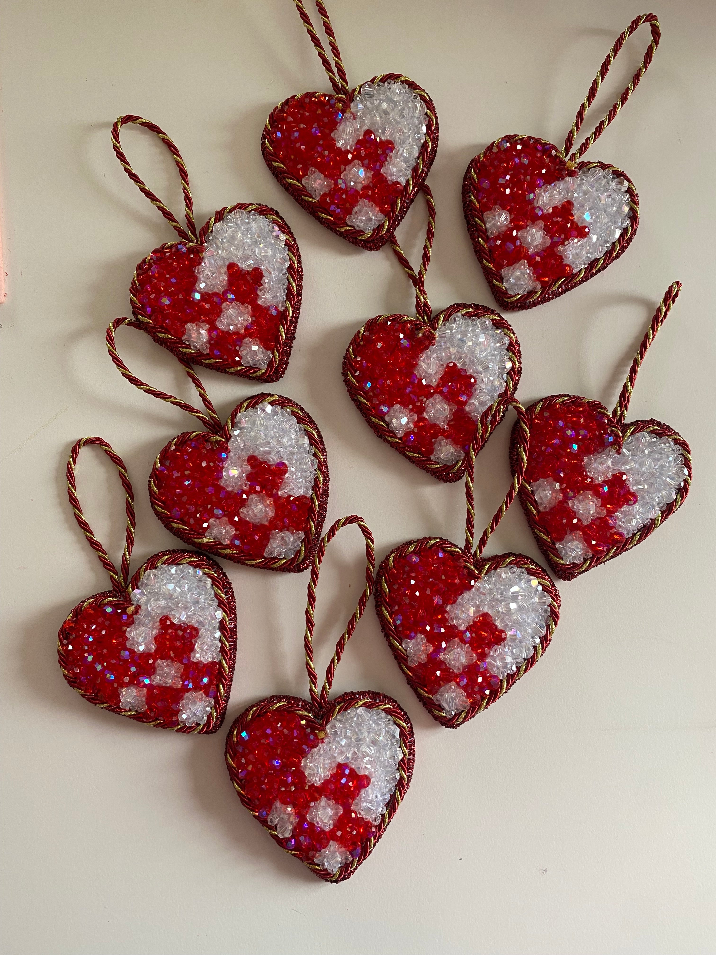 Pynt op til jul med håndsyede, flettede julehjerter, prydet med røde og hvide glasperler.