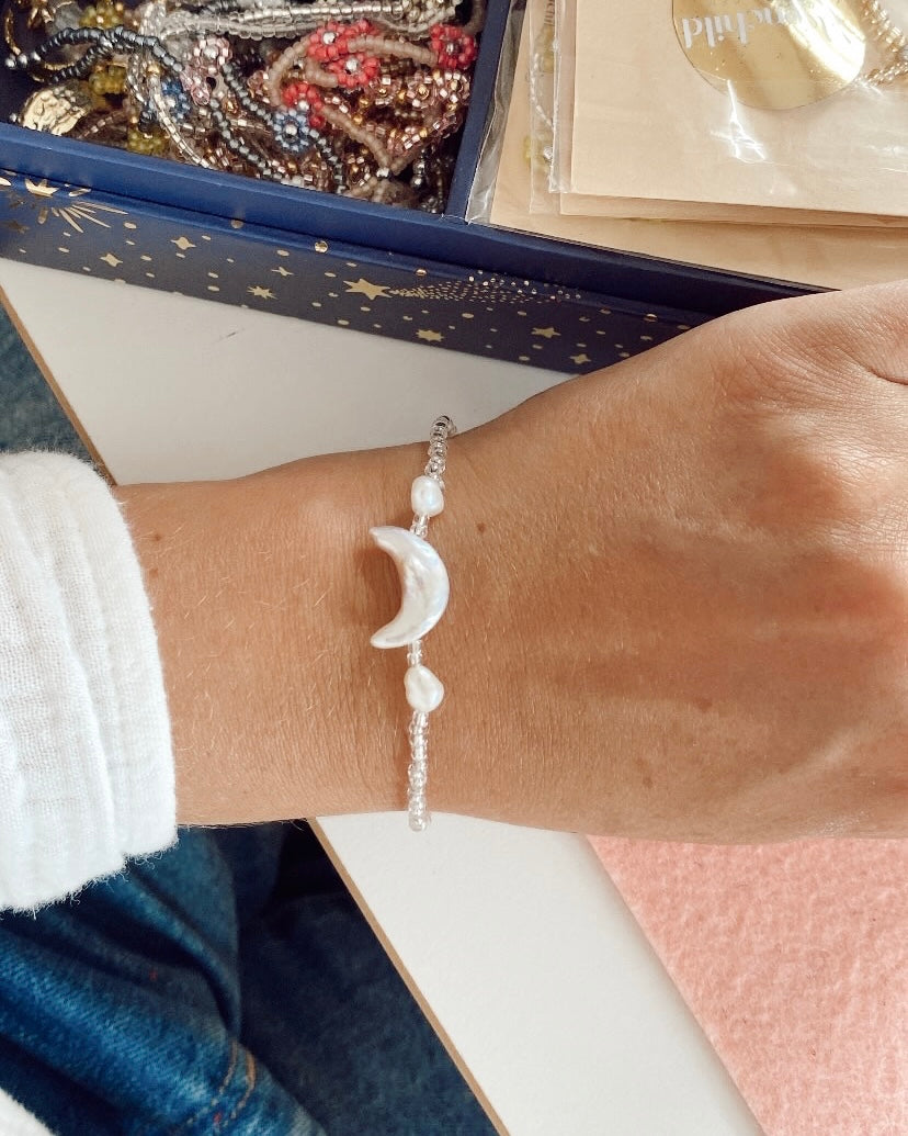 Armbåndet kombinerer det enkle og det drømmende i ét smykke. Månevedhænget symboliserer intuition og femininitet, mens perlerne tilfører klassisk elegance. Det passer smukt alene eller sammen med andre armbånd i lag-på-lag-stil.